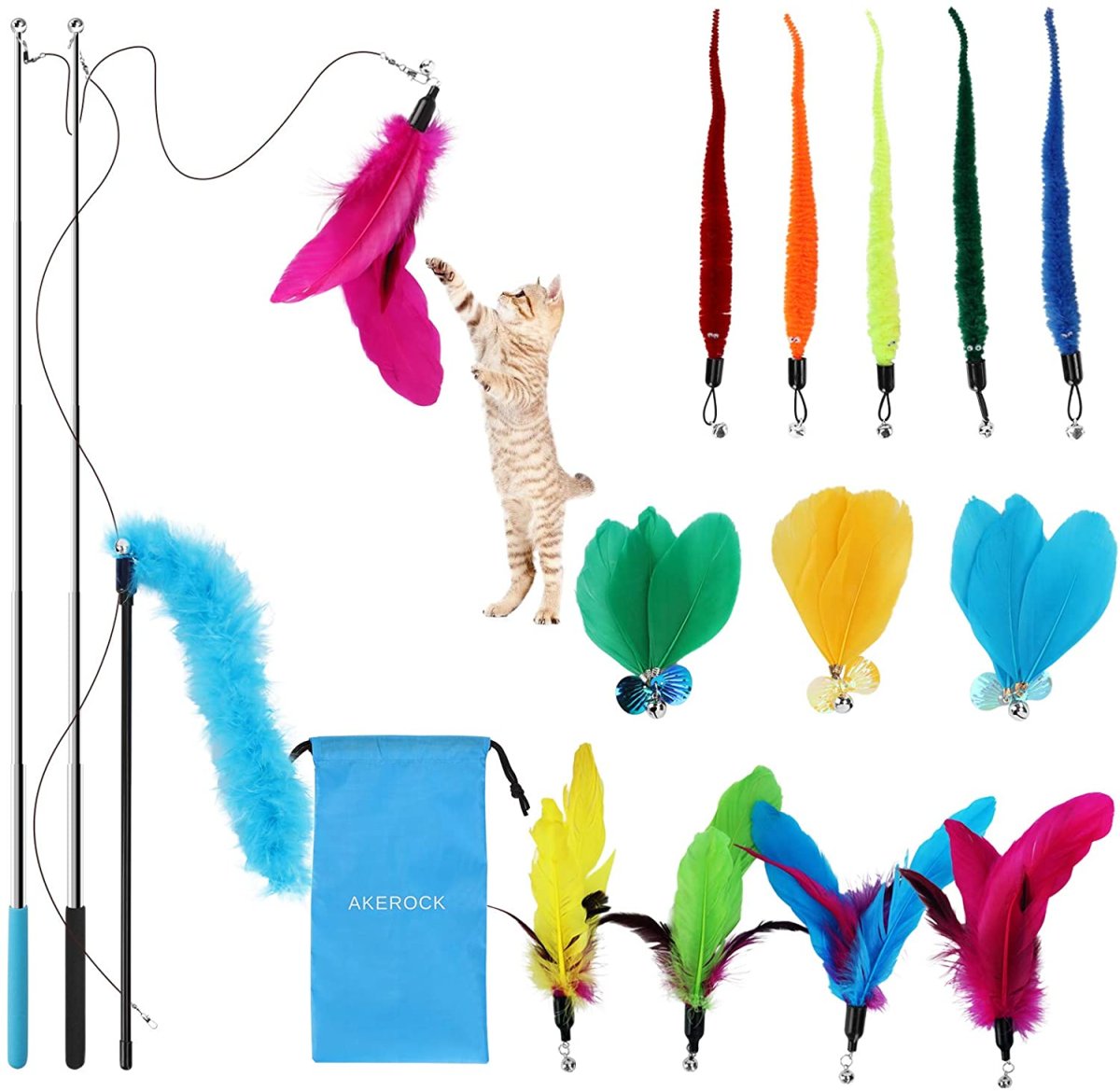 16 Pezzi Giochi Con Piume Per Gatto, Gioco Per Gatti Ricambi Per Con Campanelli e Giochini Con Piume, Inclusi 2 Bacchetta Interattiva Retrattabile, 1 Bastone Per Gatti Con Piume in Casa e Custodia